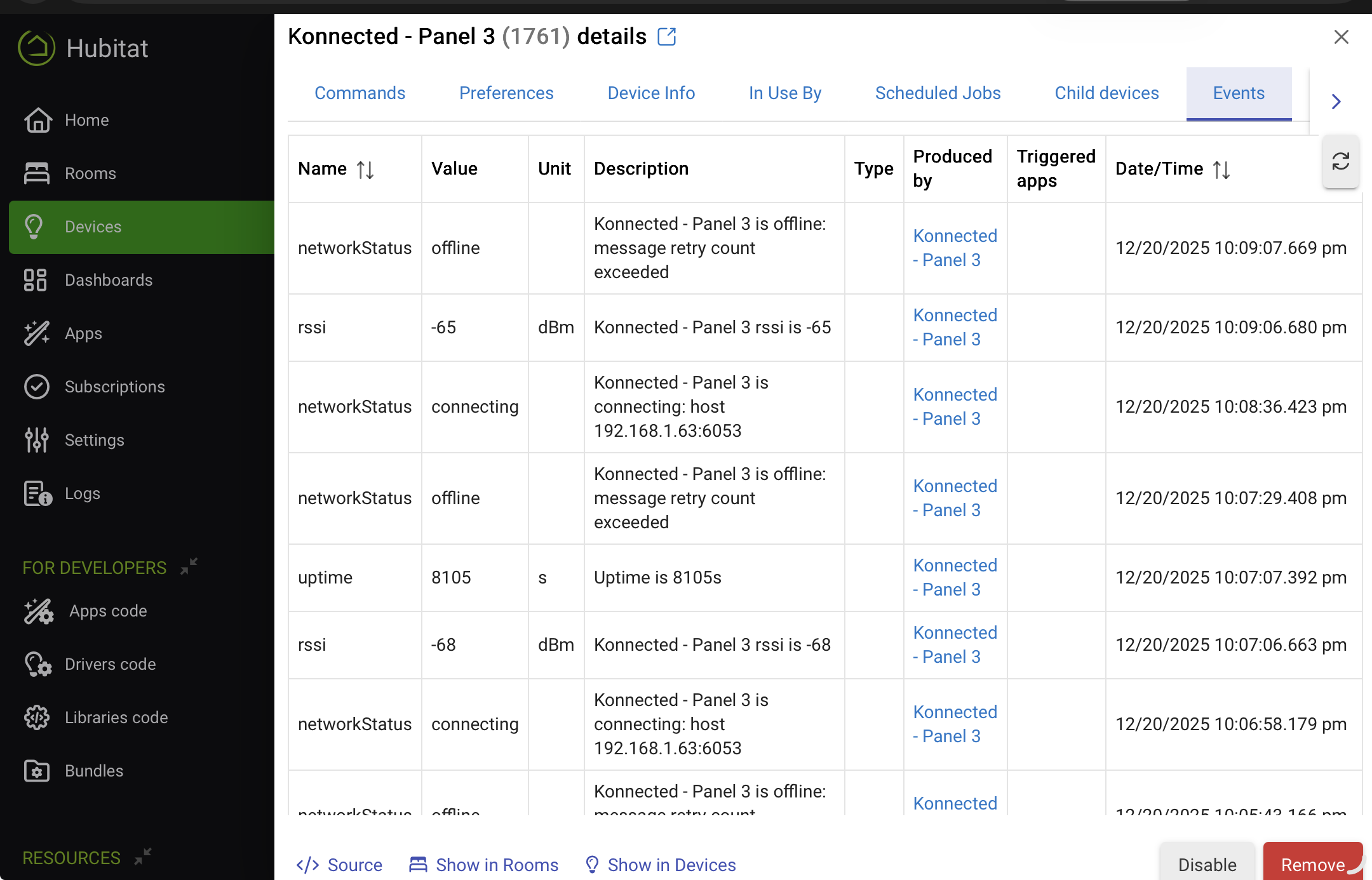 I have a Konnected system (5 modules), and recently they have started not reporting status and also the blue light is blinking like they have lost Wi-Fi. They are integrated with a Hubitat C8. In Hubitat, these entries keep repeating: