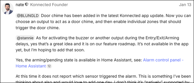 Hello @nate ! Sorry, I just meant that I implemented myself via Template Alarm Control Panel — ESPHome and with flashing my own firmware via your instructions on ESPHome Firmware Customization Basics. I wasn’t sure if the konnected implementation (via the app toggle) of alarm_control_panel was different or not.