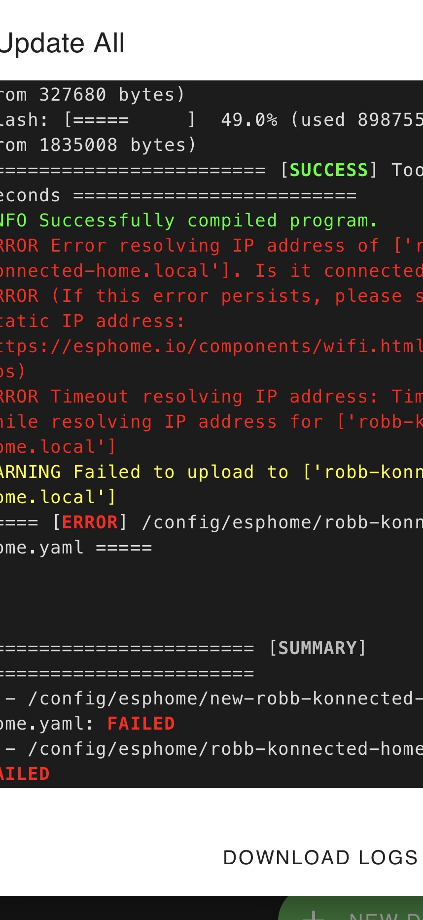 Yes I can access the devices webpage. Here is a screenshot as well as the errors from ESPhome every time Intry and update. Thank you.