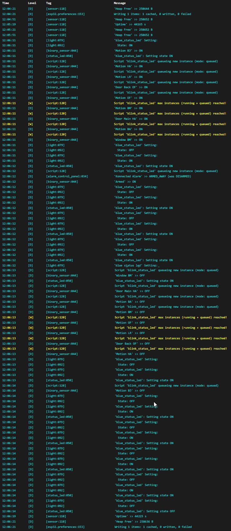 When system is disarmed, every 2 minutes (1min59 exactly), all inputs will switch to ON then OFF, also triggerring a weird error ‘Script ‘‘blink_status_led‘ max instances (running + queued) reached!’. Even Armed input (zone11 in my case) will be activated, temporary changing the state to Armed: