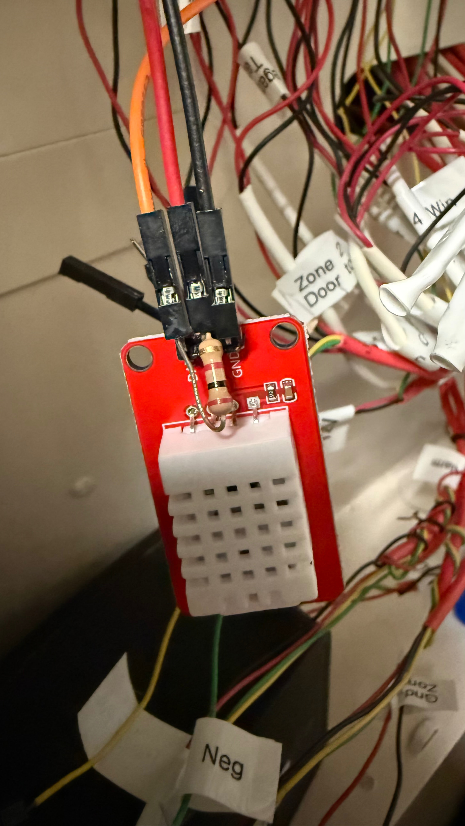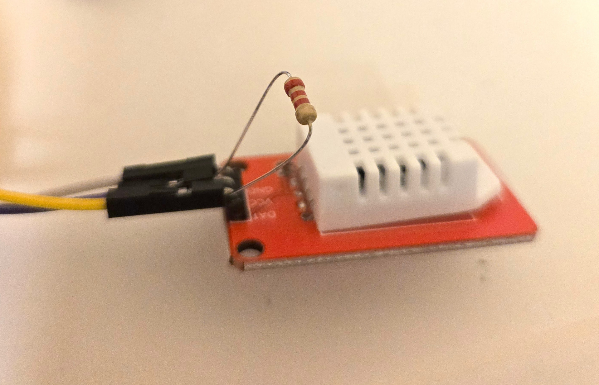 The other one, without any markings, didn’t want to work no matter what settings I gave it. Then I tried adding another resistor between VCC and DAT and now I’m getting a reading! I tried it with adding a 5.6kΩ and 2.2kΩ resistor, and both worked. I literally just jammed the ends of the resistor into the female jumpers before forcing it on to the DHT sensor pins