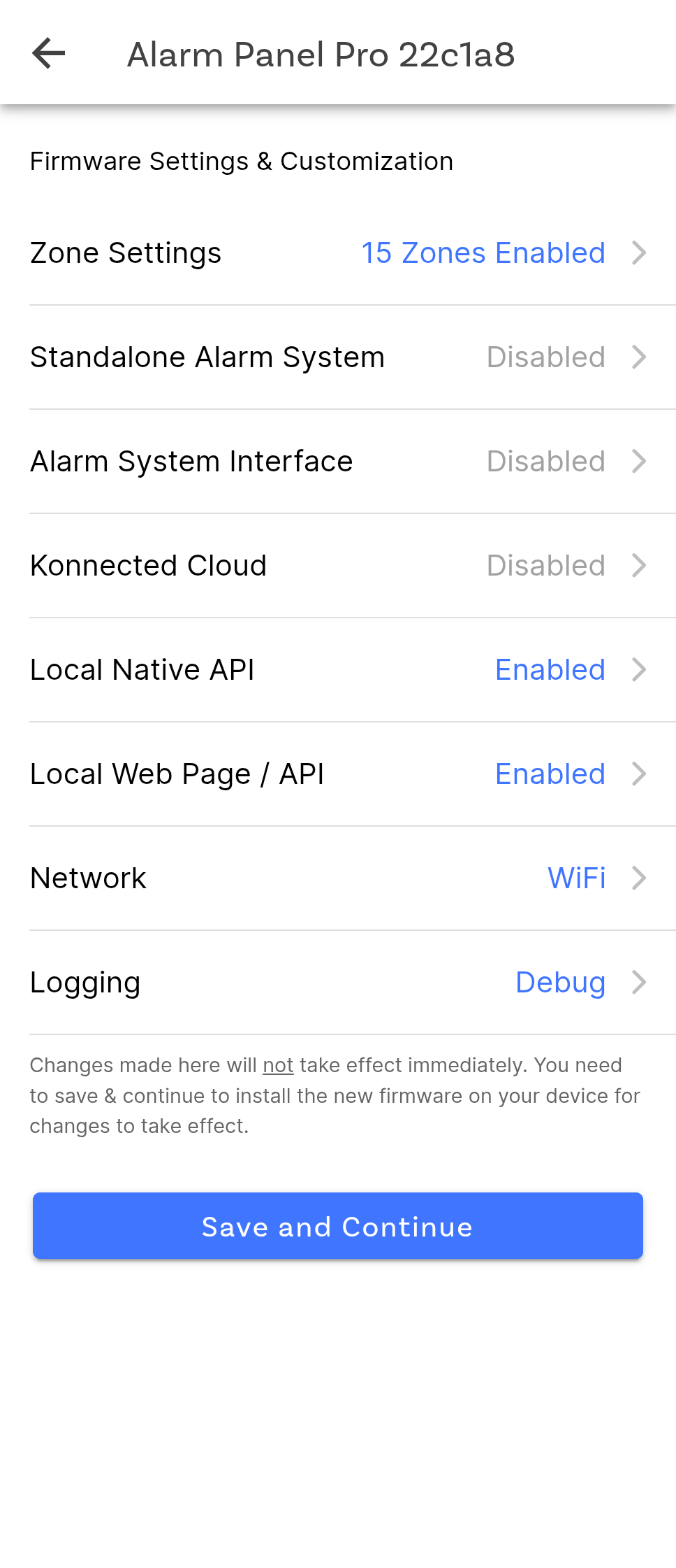 I have a very frustrating issue with my Alarm Panel Pro where every customization for zones I attempt in the Android app is immediately discarded, before the firmware build submit job even. It was working fine until I tried to do it roughly the 4th time. The last time it worked, I enabled all 15 zones so now it seems to be ‘stuck’. E.g. when I click on 'Zone Settings’ in the screenshot, make changes, and press back to get to this screen, no changes are saved; if I hit ‘Save and Continue’, the summary of the build job also doesn’t have any changes, and if I build the firmware it also has no changes.
